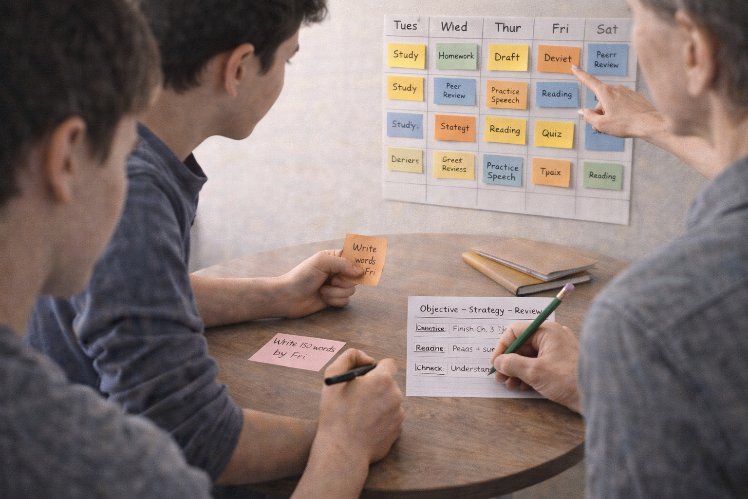 Introduce simple planning templates such as a three-step session plan—objective, strategy, review—that students can complete in a couple of minutes before they begin working. Show how to estimate time, choose an evidence-based strategy (practice testing, spaced retrieval, summarizing), and set checkpoints for quick self-assessment during the session. Teach monitoring language and prompts students can use while working, like ‘What am I trying to do?’, ‘How will I check my progress?’, and ‘If this isn’t working, what will I try next?’; practice these prompts together. Regular monitoring helps students recognize when a strategy isn’t working so they adjust sooner and preserve productive study time.